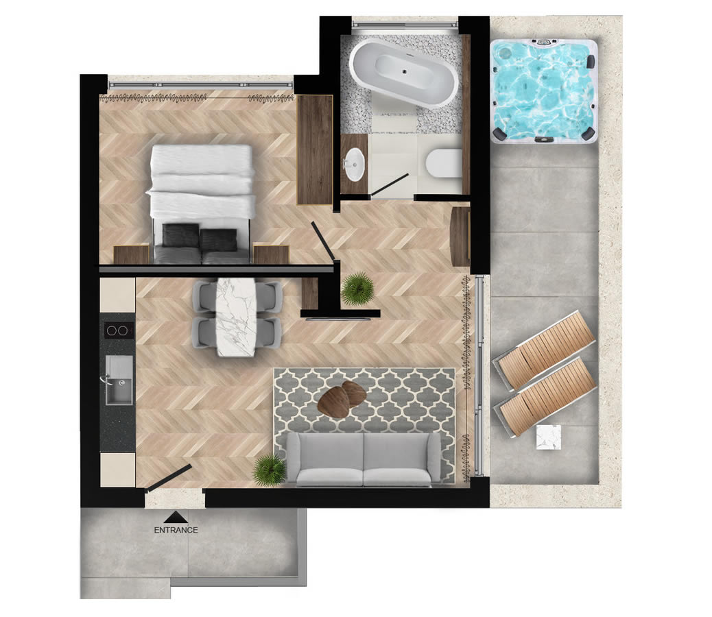 1 Bedroom / 1 Bathroom 40m² Suite | 25m² Balcony | Large Outdoor Jacuzzi | Occupancy: 2